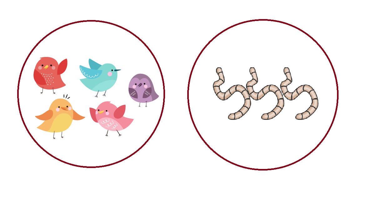 Here are some birds and here are some worms. Suppose the birds all race over, and each one tries to get a worm. Will every bird get a worm? How many birds won't get a worm?