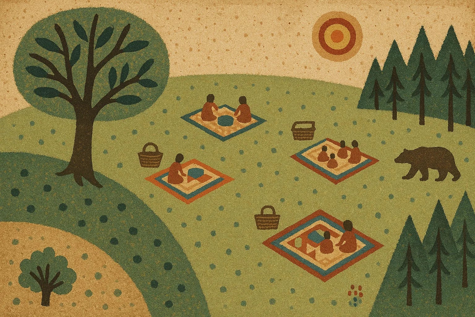 I’d bet that you could easily imagine today a half-dozen picnicking families, strangers to each other, all arriving at about the same time as you in the little parking lot just behind your shady tree—and not talking to each other, only amongst their private familiar parties. And I’d bet that you could easily imagine today those same families being unusually talkative in the lot if they all had to high-tail it to their cars while the bear eventually got spooked and ran away. Well, of course. They just watched (we)—and were in (me)—a ‘scene,’ together!